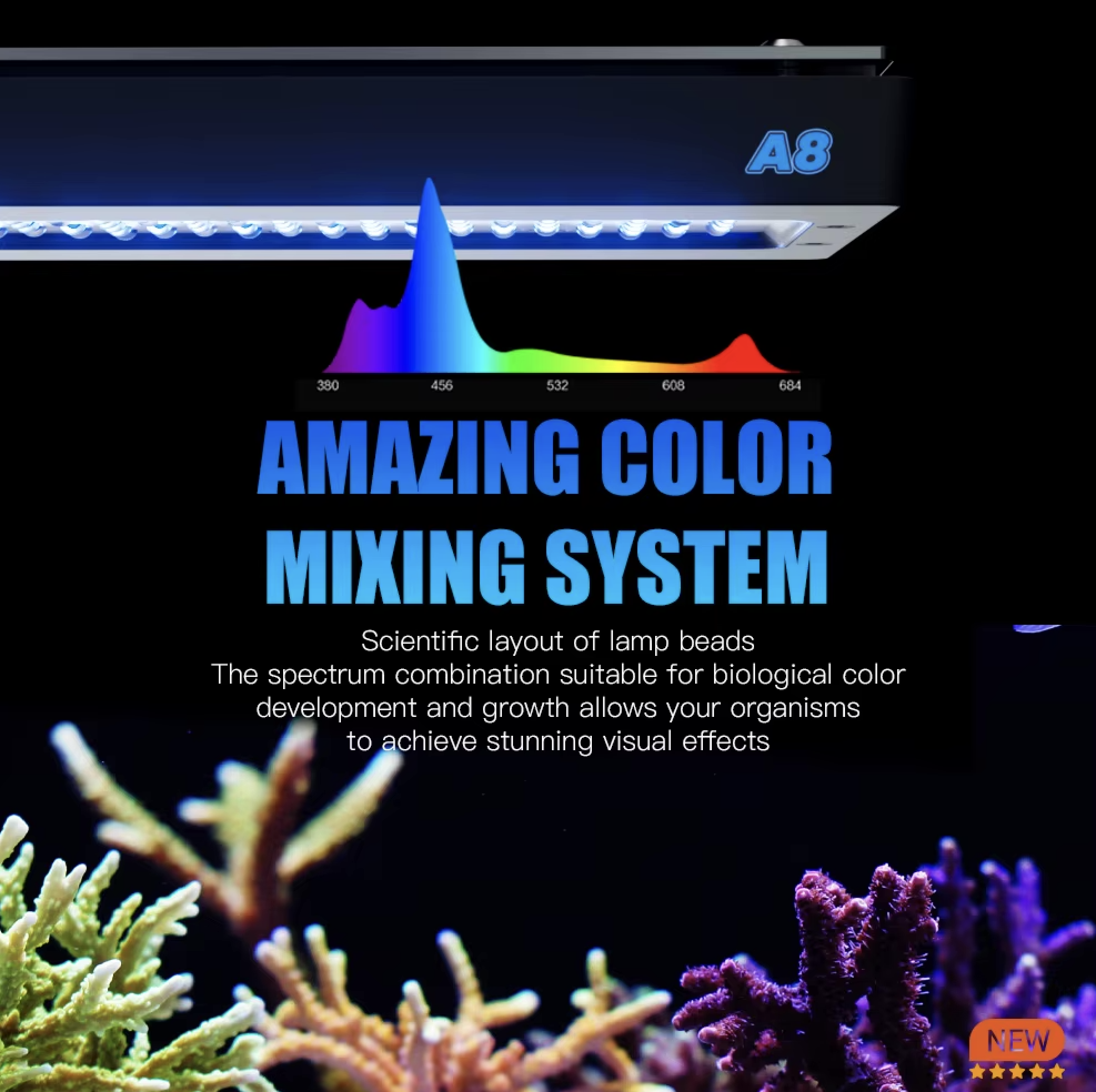 De AIPAI A8 SE maakt gebruik van hoogwaardige AIPAI LED Beads met een totaal vermogen tot 230 watt. De speciaal ontworpen LED-layout, gebaseerd op een G5-achtige lichtverdeling, zorgt voor een uitstekende mix van groeispectrum en kleurweergave. Hierdoor komen koralen intens tot hun recht en wordt biologische groei optimaal ondersteund.