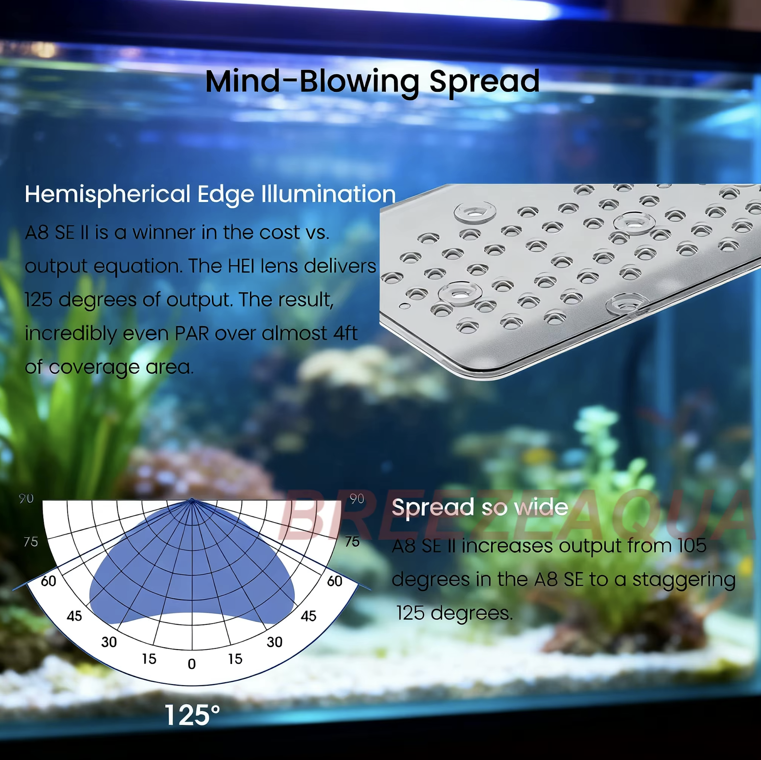 Het HEI2 Optical System met een stralingshoek van 125 graden zorgt voor een brede en gelijkmatige lichtverdeling. Hierdoor worden schaduwen geminimaliseerd en krijgt het hele aquarium een consistente verlichting.