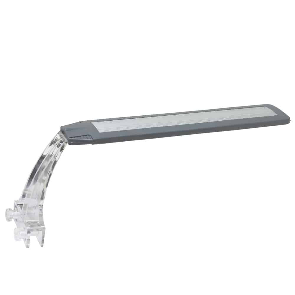 De lamp wordt geleverd met een stevige glasrandbevestiging geschikt voor aquaria tot 12 mm glasdikte. De montage is snel en eenvoudig: plaats de lamp op de glasrand en draai de bevestigingsschroeven handmatig vast. De transparante acryl arm zorgt voor een minimalistische uitstraling met minimale visuele impact.