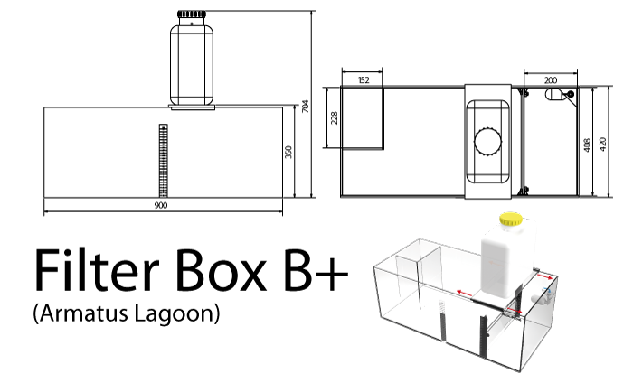 - Glazen kastfilter met voorfilterkamer, twee helderwaterkamers voor gebruik met extra biologische en mechanische filters (bijv. skimmer, multireactor, enz.) en filtermedia