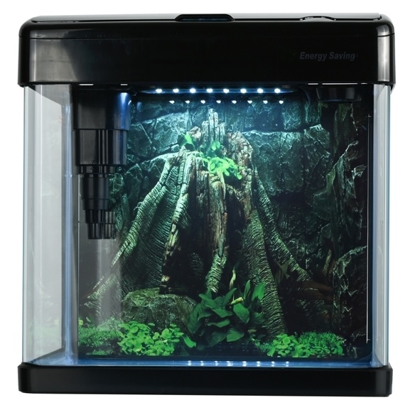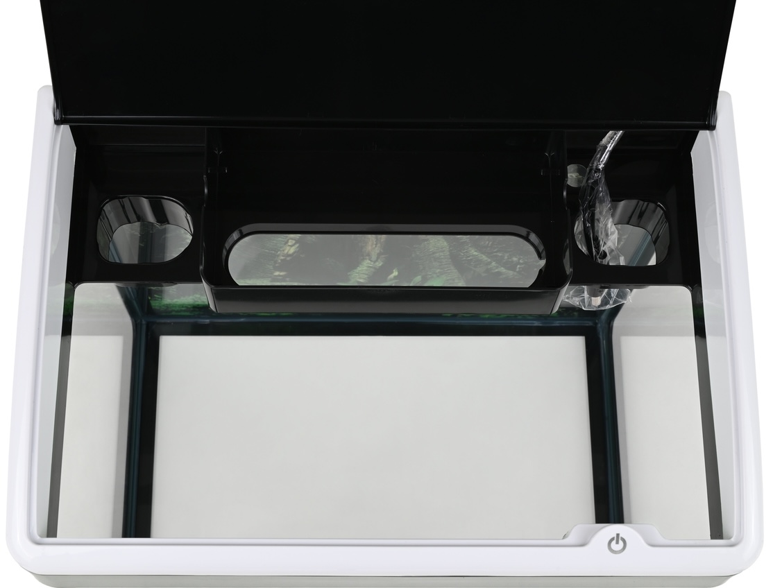 Het aquarium is voorzien van helder frontglas van 4 mm dik, een energiezuinige LED verlichting en een intern filtersysteem met mediacartridge en filterpads. De geïntegreerde micro touch schakelaar maakt het eenvoudig om de verlichting te bedienen.
