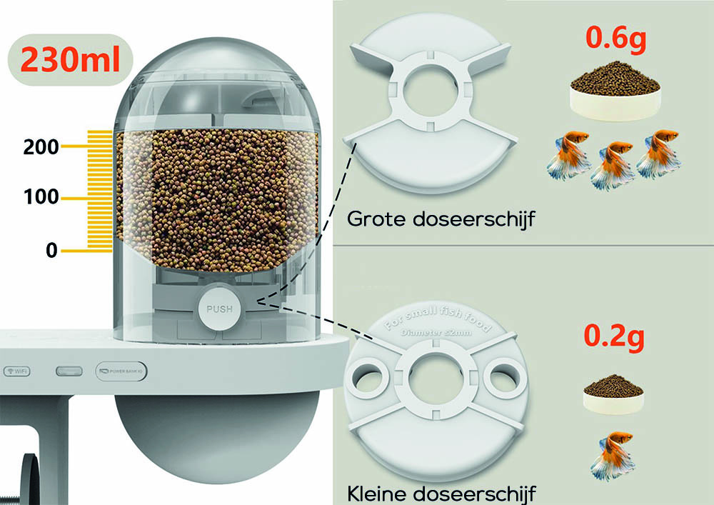 De Visual Fish Feeder is geschikt voor droogvoer van 0,3 tot 5 mm, zoals pellets en kleine sticks (niet geschikt voor vlokvoer). Het apparaat wordt gevoed via een USB-C aansluiting en beschikt over een voercontainer van 230 ml die het voer droog en vers houdt.