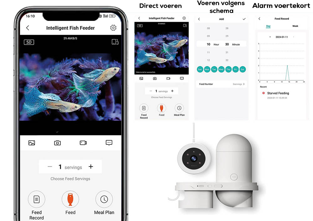 Dankzij de geïntegreerde camera met infrarood nachtzicht kun je je vissen ook in het donker observeren. Realtime monitoring en automatische meldingen bij een laag voerpeil zorgen ervoor dat je altijd weet dat je vissen goed verzorgd worden, zelfs wanneer je niet thuis bent of op vakantie.