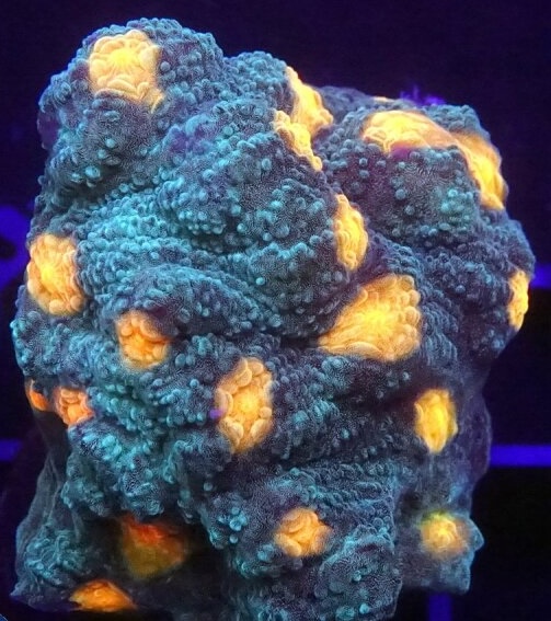 Een Chalice is een plaatvormig koraal met duidelijk kleurverschil tussen poliepen en het overige vlees. Dit grote contrast zorgt voor een prachtige tekening. De Mycedium Robokaki Chalice is grijs met oranje poliepen. Dit is één van de mooiste en meest populaire Chalice.