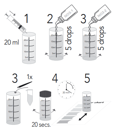 - Wacht 20 minuten en bepaal de NO3-waarde met behulp van de meegeleverde kleurkaart