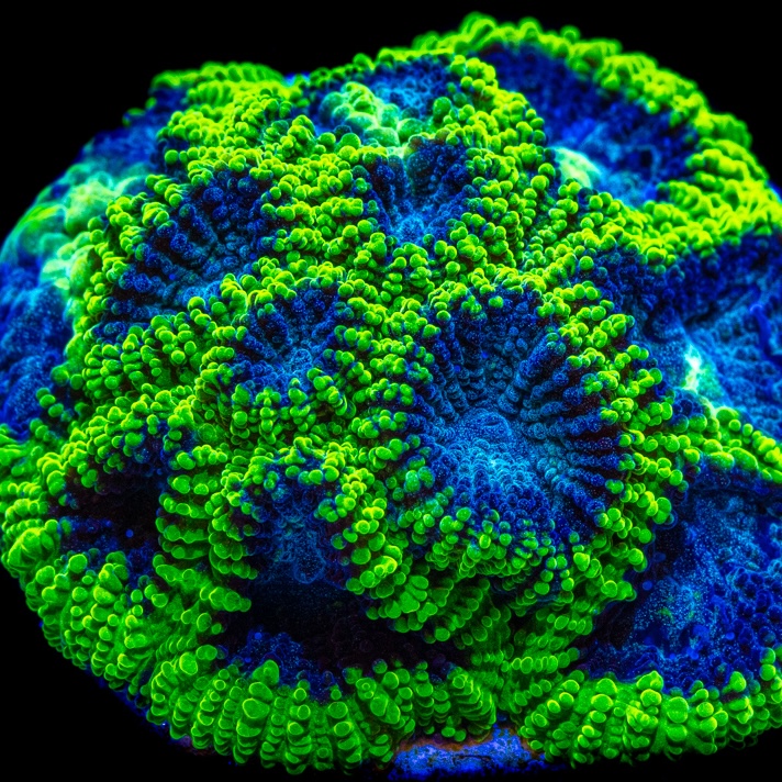 De Favia Midnight Princess is een elegante LPS-koraal met een diep donkerblauwe tot paarse basis en neon-groene mondschijven (soms met goud/teal accenten). De dikribbelige structuur en het mozaïekpatroon geven een luxe “midnight” uitstraling die onder blauw licht spectaculair oplicht. Groeit rustig tot compacte, koepel- of encrustende kolonies en past daardoor perfect in zowel strakke als natuurlijke rifscapes.
