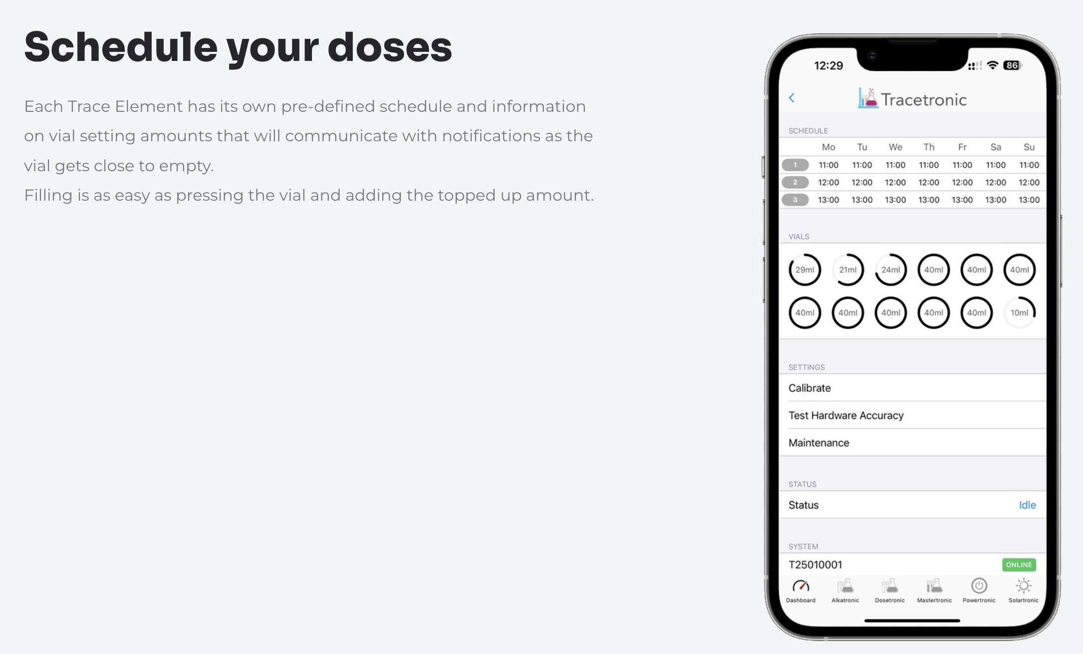 Het apparaat bevat 12 geïntegreerde flacons van elk 40 ml voor verschillende trace elementen. Hierdoor zijn er geen externe flessen of losse doseersystemen nodig.