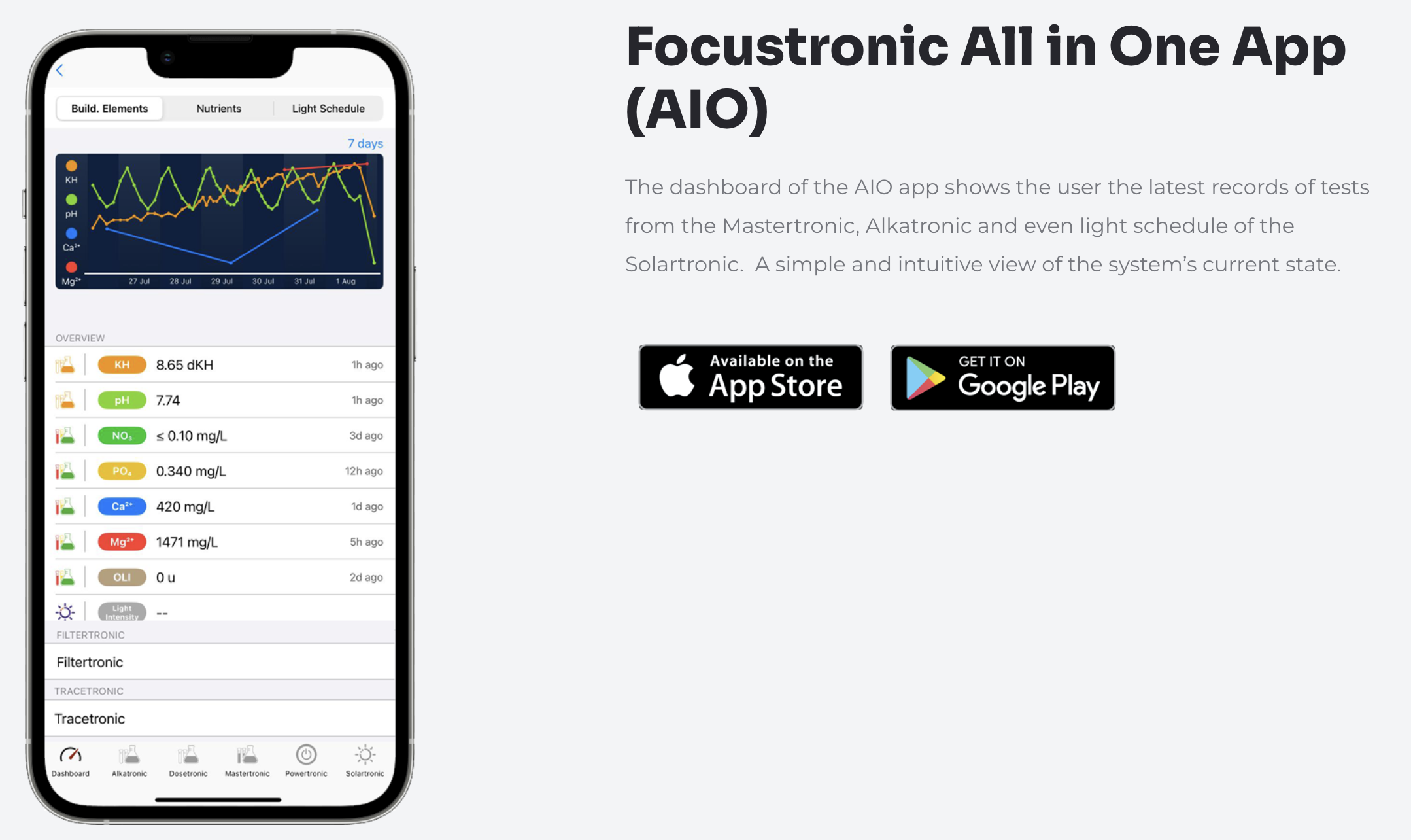 Het dashboard geeft een duidelijk overzicht van meetresultaten, doseringen en lichtinstellingen, zodat je aquarium eenvoudig te monitoren is.