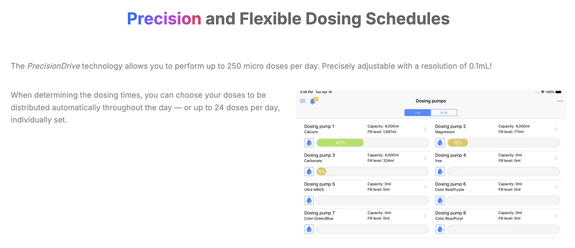 - Ultranauwkeurige doseerpompen met een resolutie tot 0,1 ml