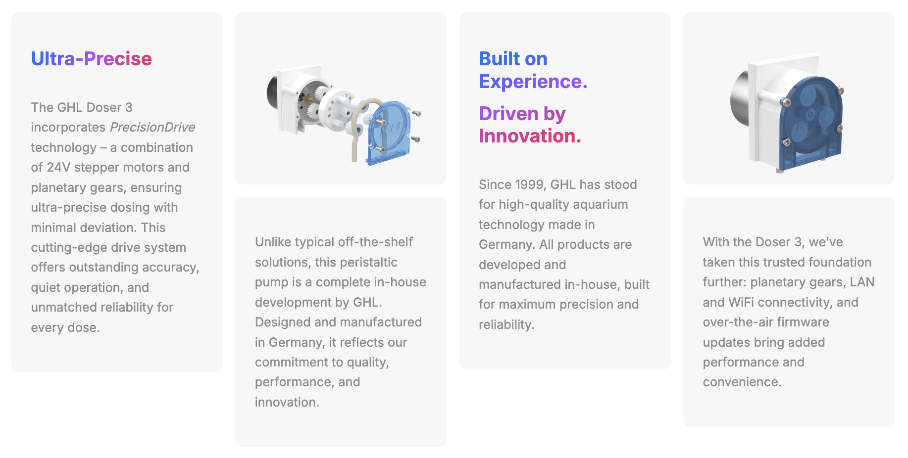De GHL Doser 3 is de nieuwste generatie doseerpompen van GHL, ontworpen voor maximale precisie, betrouwbaarheid en gebruiksgemak. Of je nu kiest voor de standalone (SA) of extension (EXT) versie, de Doser 3 biedt een professionele oplossing voor het automatisch doseren van supplementen, ballingzouten, aminozuren en andere toevoegingen in je zeeaquarium.