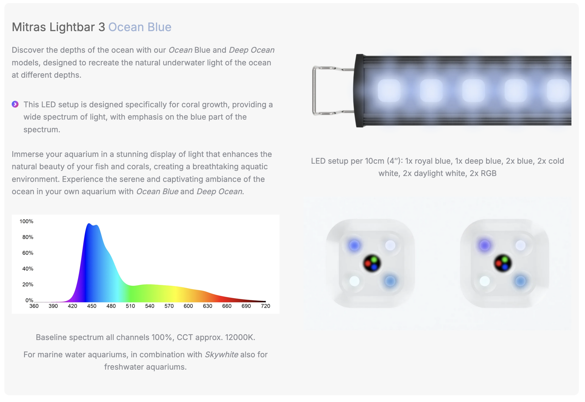 De Mitras Lightbar 3 Ocean Blue is speciaal ontwikkeld om het natuurlijke onderwaterlicht van de oceaan te simuleren, op verschillende dieptes. Deze lichtbalk is ideaal voor zeewateraquaria en richt zich met name op optimale koraalgroei en het versterken van natuurlijke kleuren.