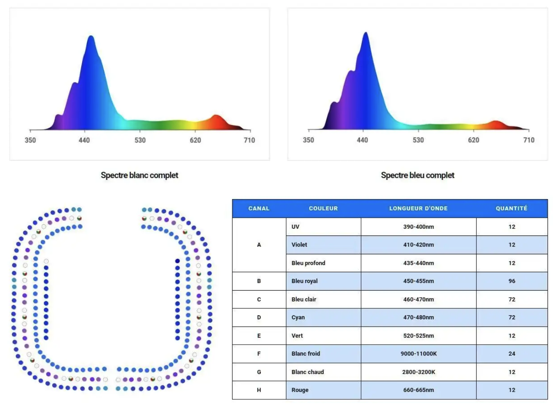 - Kanaal A: 12 UV-leds (390/400 nm) + 12 violette leds (410-420 nm) + 12 diepblauwe leds (435-440 nm)