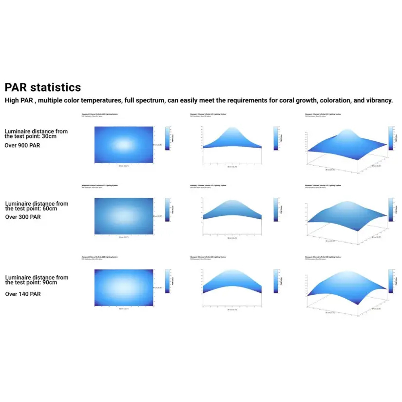 Dankzij de geavanceerde multispectrale technologie reproduceert de Maxspect Ethereal Infinite E8-230 de natuurlijke lichtomstandigheden van koraalriffen getrouw. Door de integratie van een breed spectrum aan golflengten stimuleert het de groei en kleuring van koralen en zorgt het voor een gelijkmatige verlichting. Of u nu zachte, harde of gemengde koralen hebt, met deze LED-ramp kunt u de verlichting aanpassen aan de specifieke behoeften van elke soort. Het spectrum is nauwkeurig instelbaar om verschillende dieptes van de oceaan en natuurlijke lichtvariaties te simuleren. Zo ontstaat een optimale omgeving die getrouw is aan de natuurlijke koraalhabitats.