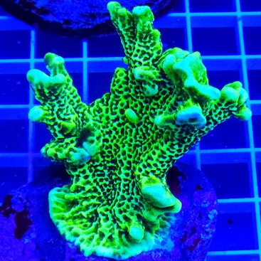 Montipora confusa, takvormig / plaatvormig SPS koraal. Mooi SPS koraal met fijne, zichtbare poliepjes. Fel groen / geel van kleur met rood / bruine poliepen