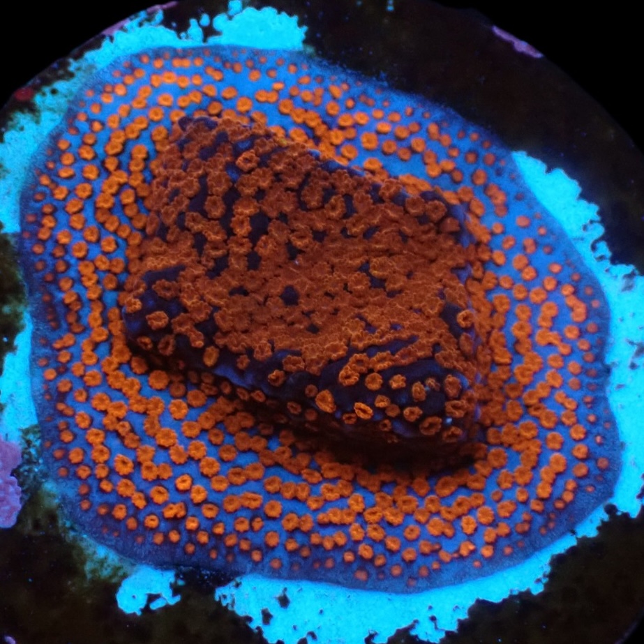 Montipora Superman, plaatvormig SPS koraal. (rode poliep, blauwe basis).
