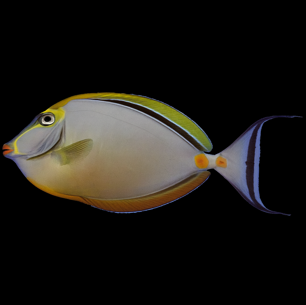 De Naso elegans, ook wel de Rode Lip Eenhoornvis of Indian Ocean Blonde Naso Tang genoemd, is een indrukwekkende en populaire riftankbewoner. Deze vis staat bekend om zijn sierlijke lichaamsbouw, zachte zwemstijl en opvallende kleuren. De helder oranje accenten rond het gezicht, de contrasterende zwarte maskerlijn en de gele rugvin maken dit een echte blikvanger in middelgrote tot grote aquaria.