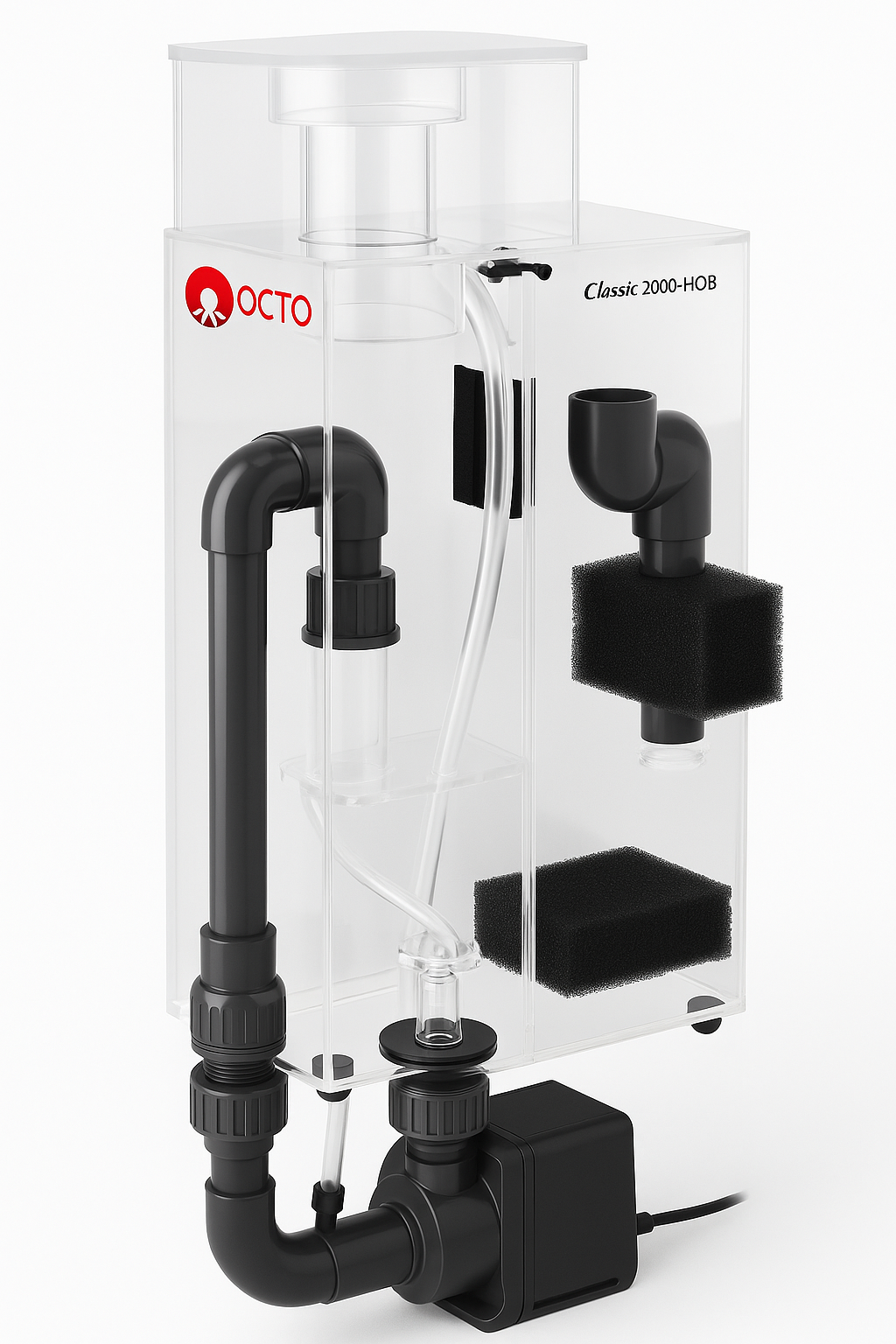 De Octo Classic 2000-HOB is een krachtige hang-on eiwitafschuimer voor mariene aquaria. Het toestel is ontworpen voor aquaria zonder sump en hangt eenvoudig aan de achterkant van het aquarium. Dankzij de externe pomp, die onder de skimmer is bevestigd, neemt het apparaat weinig ruimte in beslag en wordt er minder warmte aan het water afgegeven. De behuizing is gemaakt van helder acryl, waardoor je de werking en het schuimproces goed kunt volgen. Deze hang-on skimmer is zeer geschikt voor aquaria met een middel tot zware belasting.