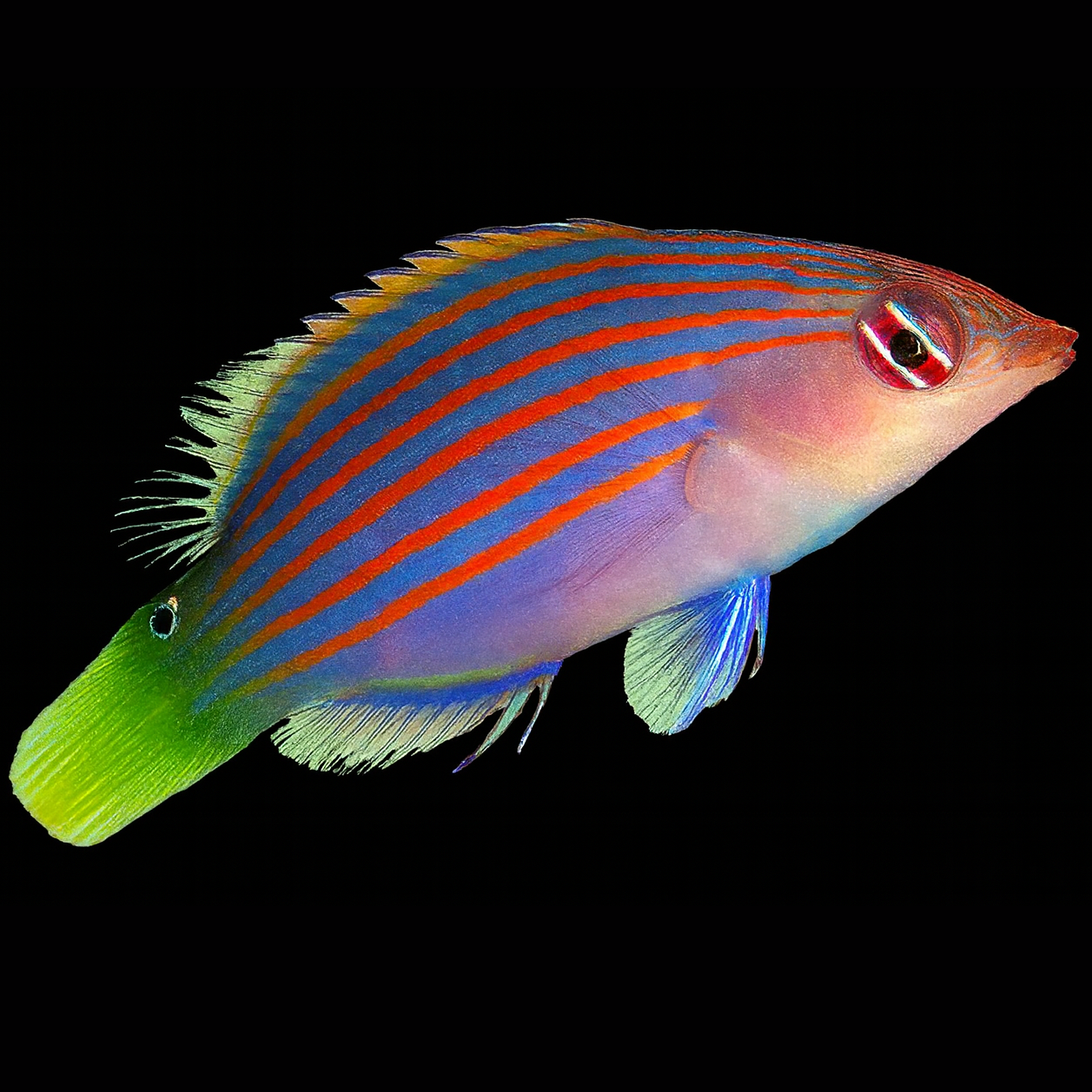 De Pseudocheilinus hexataenia, beter bekend als de zesstrepenlipvis, is een populaire en kleurrijke rifbewoner die geliefd is bij zeeaquarianen over de hele wereld. Met zijn levendige kleurenpatroon van felrode en blauwe horizontale strepen over het hele lichaam en een felgroene staart is deze vis een ware blikvanger in elk zeewateraquarium.