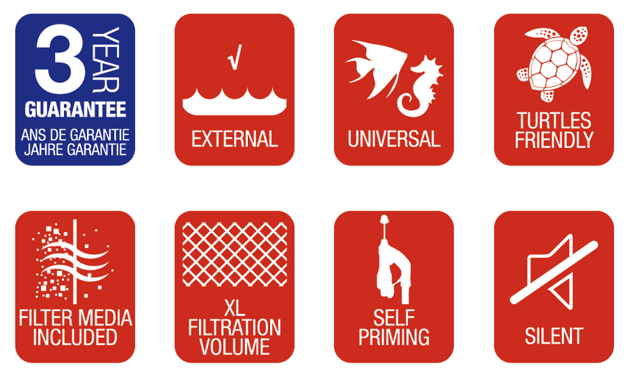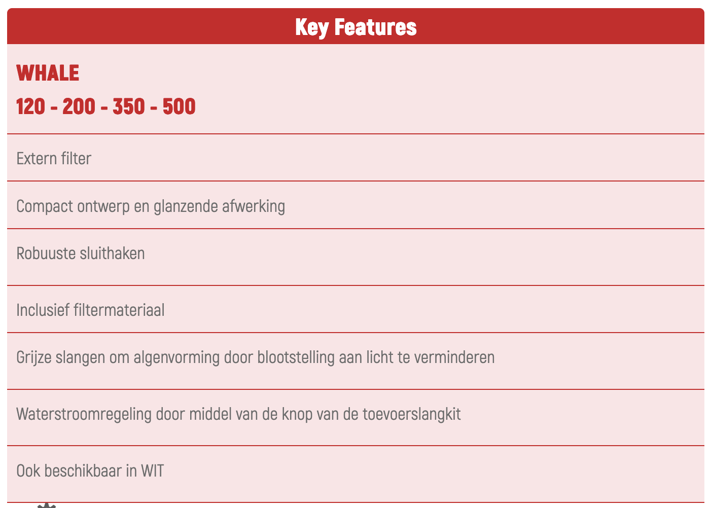 De WHALE externe filters onderscheiden zich door hun design en verfijnde afwerking. Ze zijn bijzonder geschikt voor moderne omgevingen waar zelfs de esthetische smaak een belangrijke vereiste wordt bij de keuze van het product. Stille, efficiënte filtratie, laag energieverbruik en technische oplossingen ontworpen om het gebruik en onderhoud te vergemakkelijken, karakteriseren deze lijn van filters bestaat uit 4 modellen voor gebruik in aquaria van kleine, middelgrote en grote afmetingen.