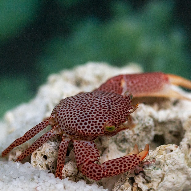 Deze symbiotische krab is een uitstekende toevoeging aan een rifaquarium met levende koralen. Hij leeft harmonieus binnen kolonies van vertakkende koralen en kan bijdragen aan de gezondheid van het koraal door het oppervlak schoon te houden van detritus en kleine parasieten.