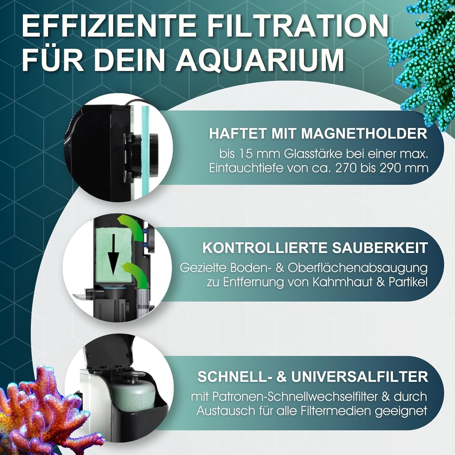 Dankzij het slanke formaat neemt het filter weinig ruimte in beslag in het aquarium. De montage gebeurt eenvoudig en veilig met de meegeleverde Magnet Holder, geschikt voor glasdiktes tot 12 mm.