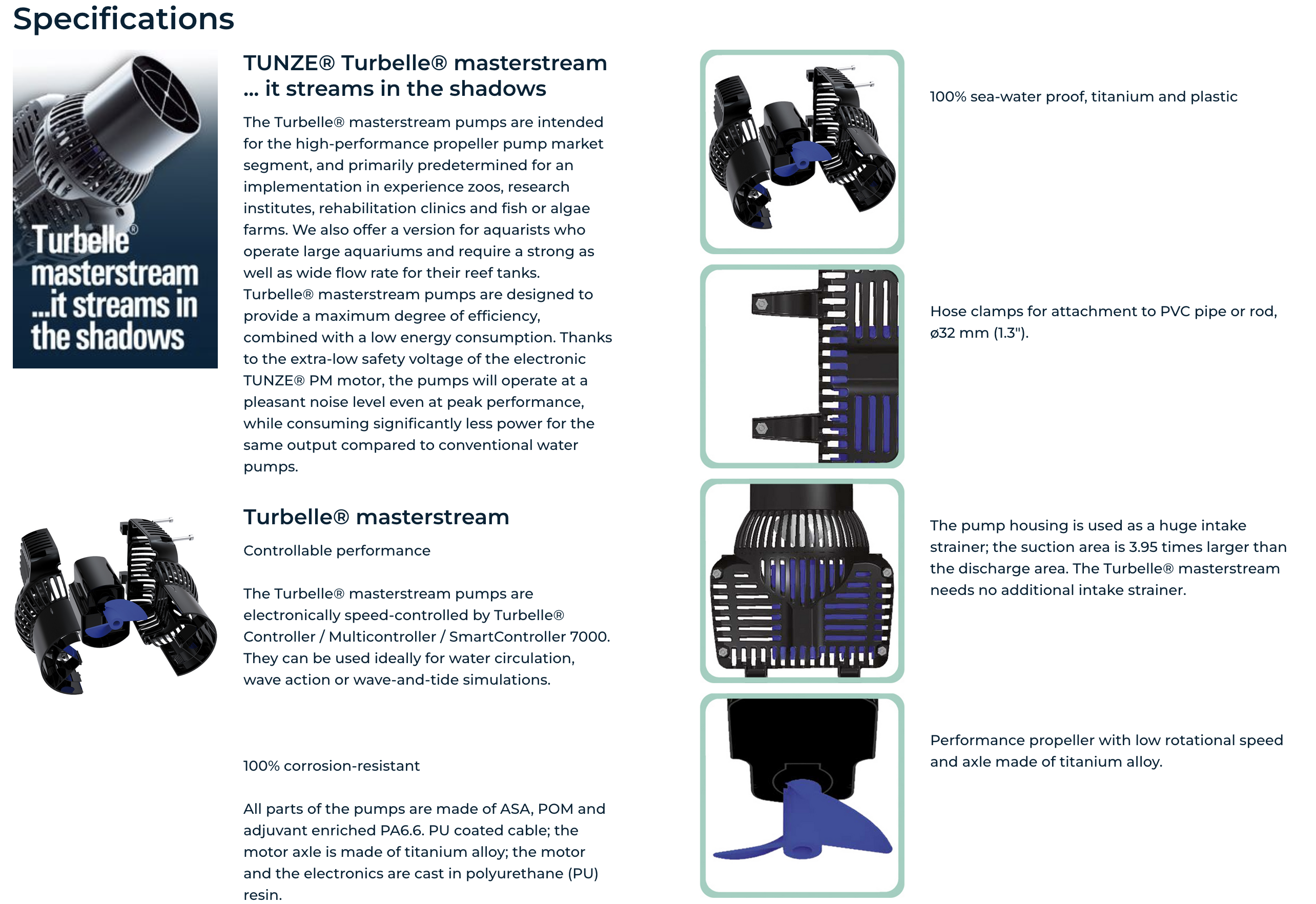 De Turbelle® masterstream 6580 is een extreem krachtige high-performance propellerpomp, ontworpen voor toepassingen waar uitzonderlijk sterke en brede waterstroming vereist is. Deze pomp is geschikt voor aquaria groter dan 20.000 liter en wordt veel toegepast in openbare aquaria, dierentuinen, onderzoeksinstituten, revalidatiecentra en vis- of algenteeltinstallaties. Daarnaast is hij beschikbaar voor veeleisende aquarianen met zeer grote rifsystemen.