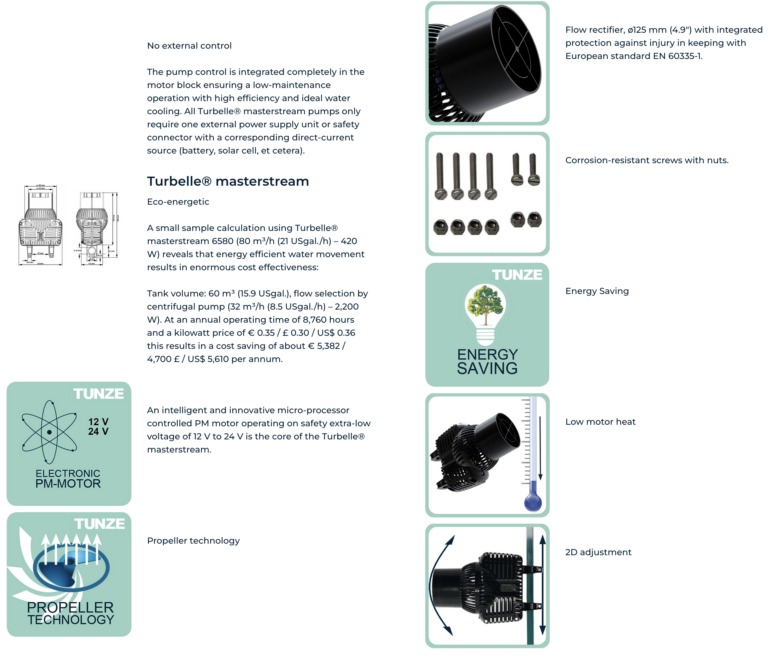 Met een instelbare doorstroming van 45.000 tot ca. 80.000 liter per uur levert de masterstream 6580 een enorme waterverplaatsing met een natuurlijke, brede stroming. Ondanks deze prestaties blijft het energieverbruik relatief laag dankzij de efficiënte TUNZE® PM-motortechnologie.