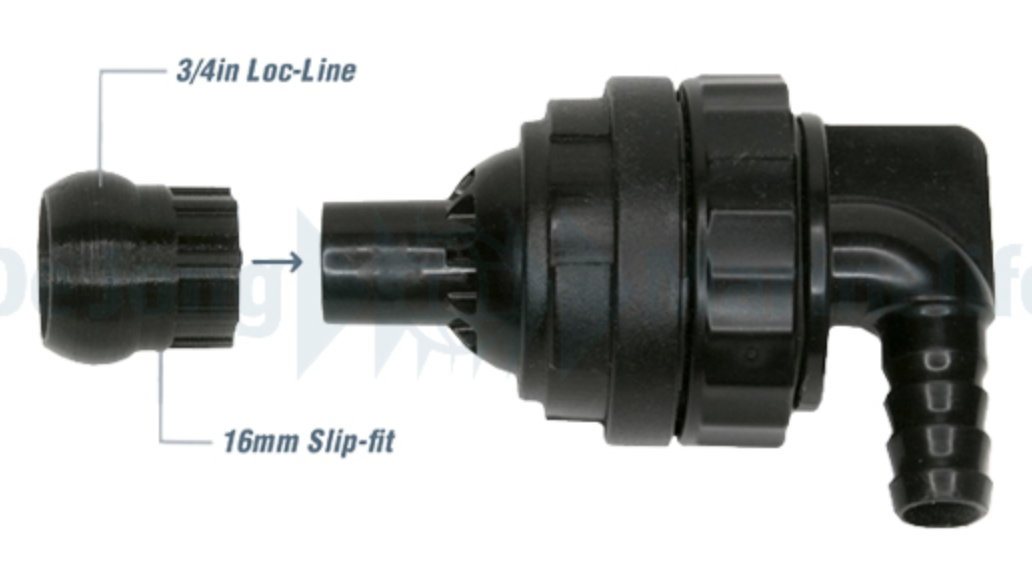 De slip-fit adapter wordt simpelweg over het uiteinde van de retouruitlaat geschoven. Binnen enkele seconden kun je daarna een 3/4 inch Loc-Line koppeling, adapter of Y-splitter aansluiten.