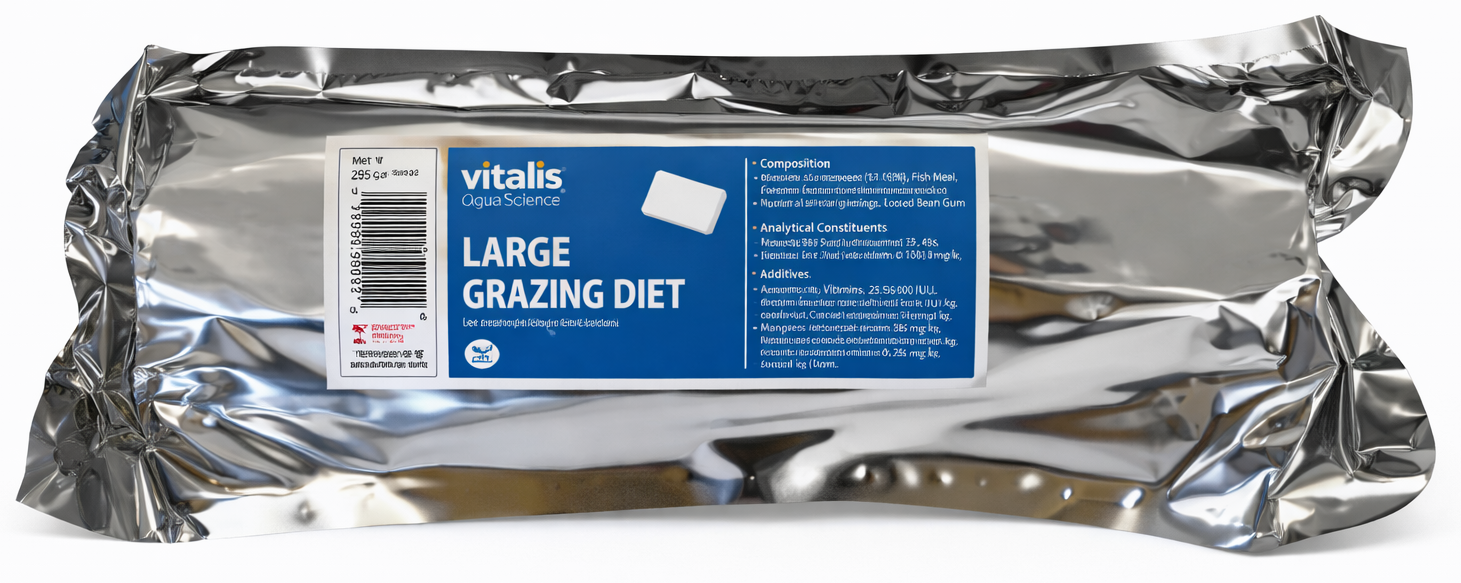 Vitalis Large Grazing Diet is een voedzaam en goed verteerbaar graasvoer dat speciaal is ontwikkeld voor vissen die van nature algen en biofilm van oppervlakken eten. Het voerblok levert een volledig en uitgebalanceerd voedingsprofiel en is geschikt voor aquaria met meerdere vissoorten.