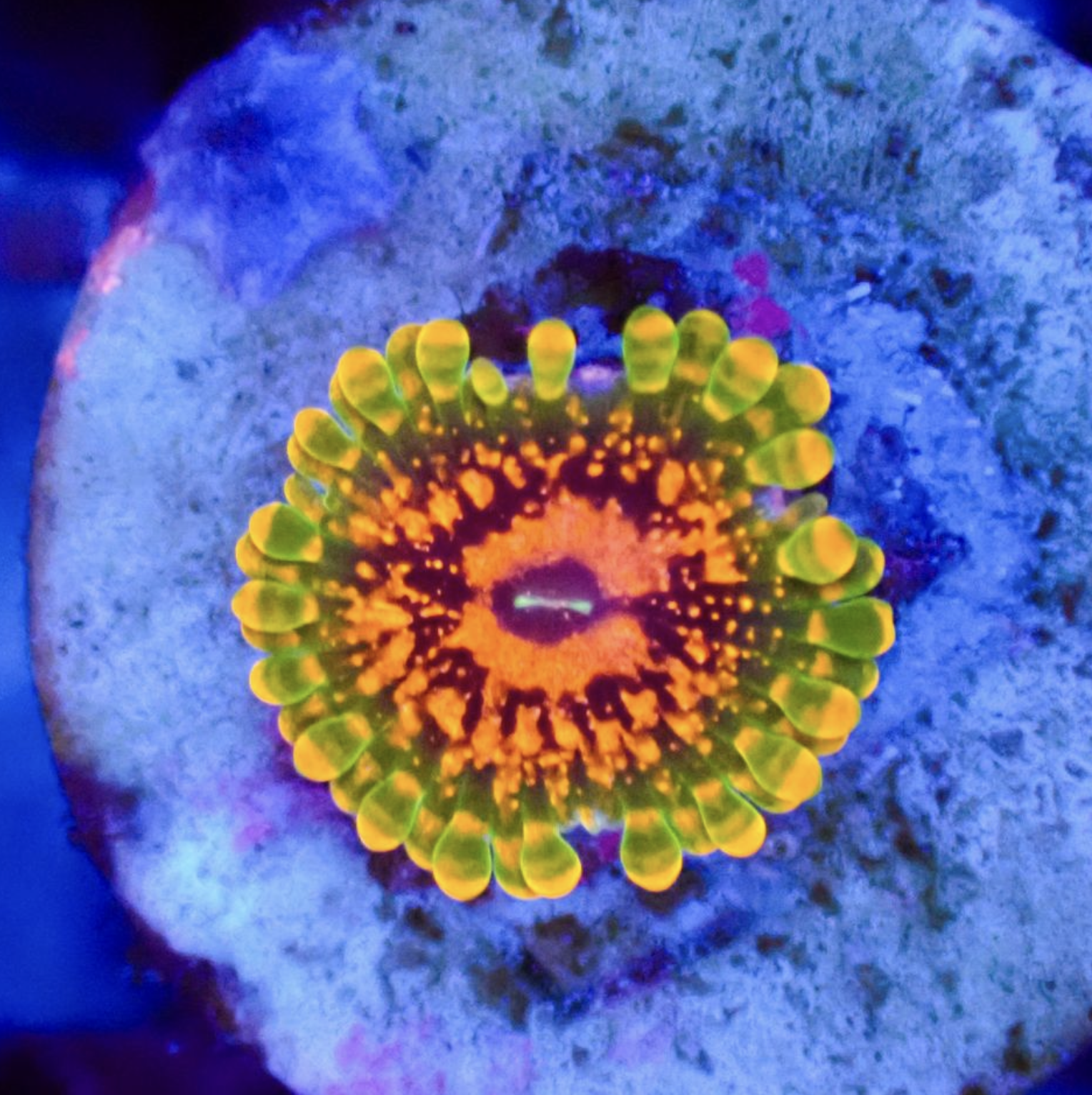 126369049 Zoanthus Blue Walter zijn bizar kleurrijke poliepen, fel, fluoriserend geel hart en verder helder blauw van kleur.